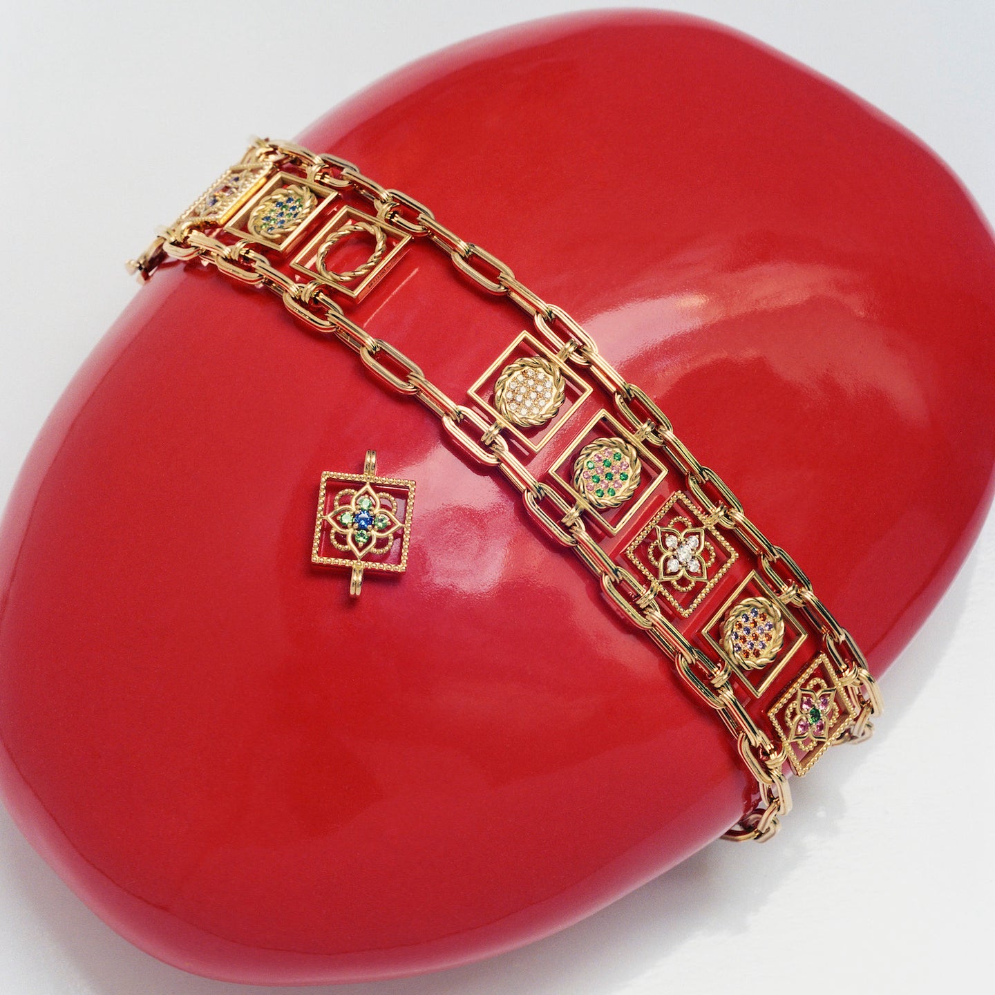 Small "Jardins Suspendus" with colorful, sparkling but above all joyful variations are thus transcribed into precious mini gold squares. Each woman, sensitive to their refinement and wishing to express her personality and taste through them, collects them and accumulates them on her wrists according to the moment and their desire. These little hanging gardens offer each woman an infinite number of combinatory aspects to express the stages of her life and her personality, always in connection with nature, which has become Naturée by the Mellerio jeweler.