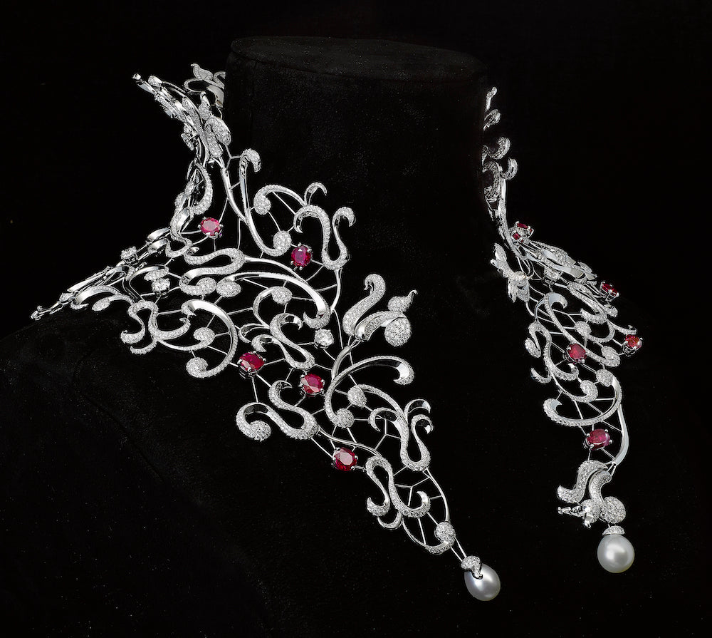 To celebrate its 400th anniversary, Mellerio has created an exceptional piece of high jewelry in tribute to Queen Marie de Médicis. It took Mellerio 10 years to harvest the exceptional rubies and 4,500 hours of work to create this highly technical piece. Indeed, lightweight and flexible, the collar adapts to all types of neck. The lilies all over the collar represent royalty.