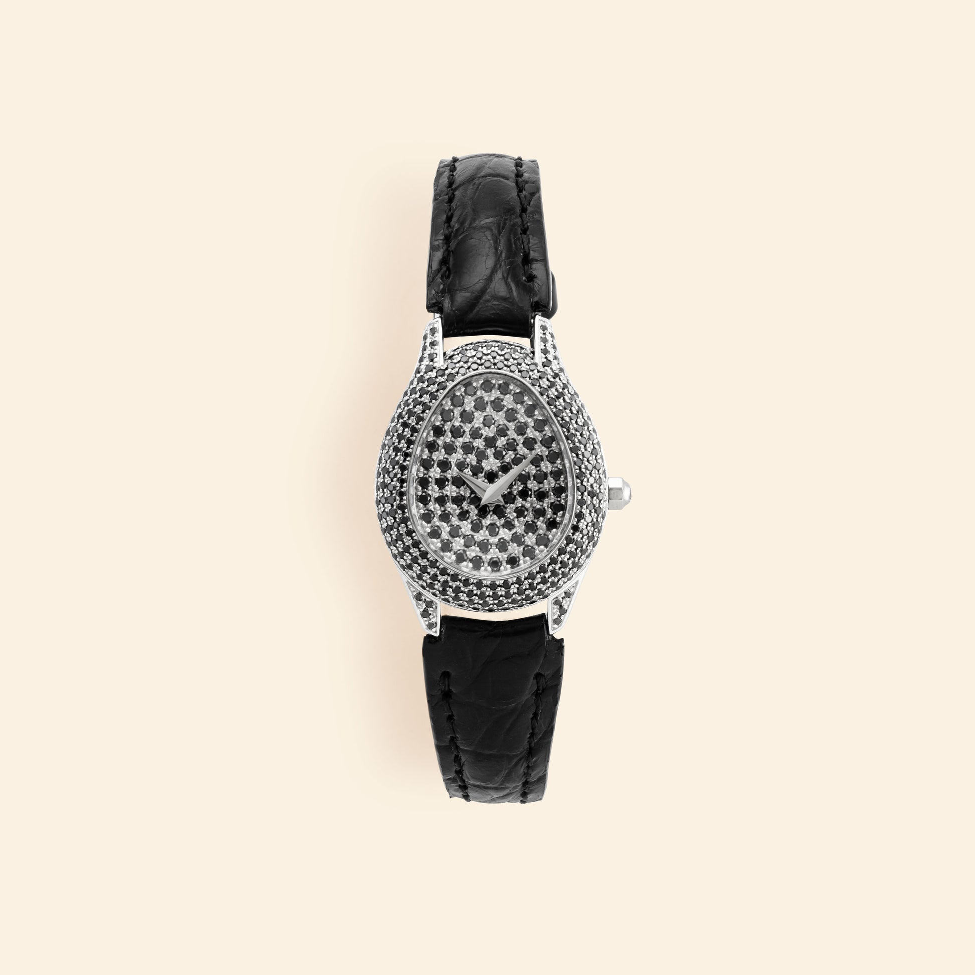 The Black Queen Watch in 18k white gold, set with black diamonds on the dial, black diamonds on the watch case and black diamonds on the clasp and crown.