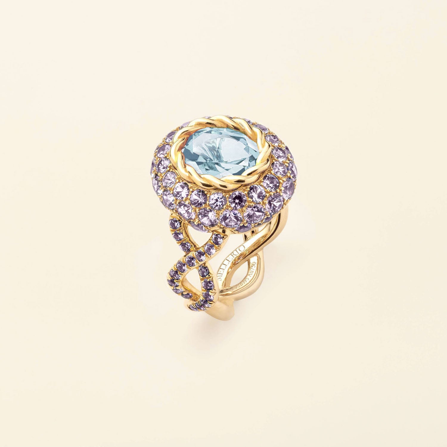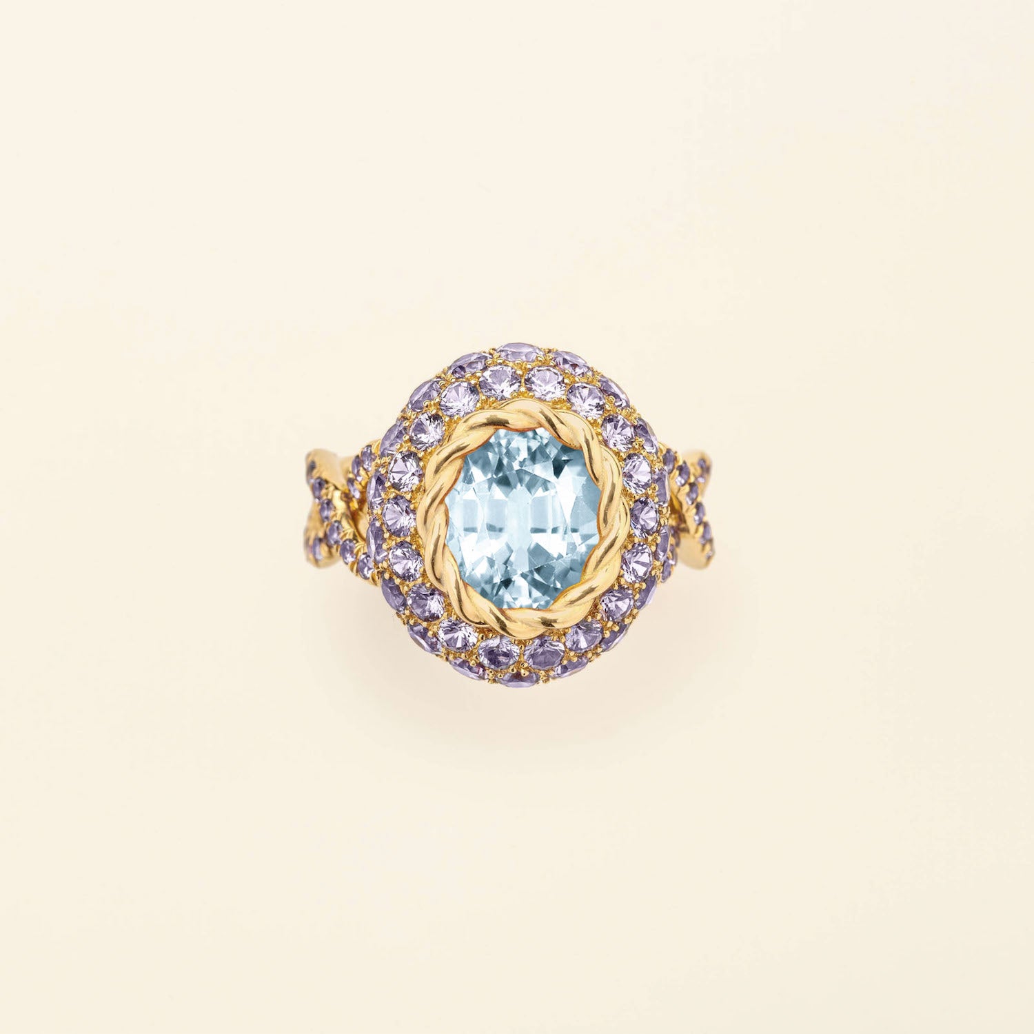 Color Queen Blues Skies ring in 18k yellow gold set with an aquamarine and surrounded by purple sapphires.