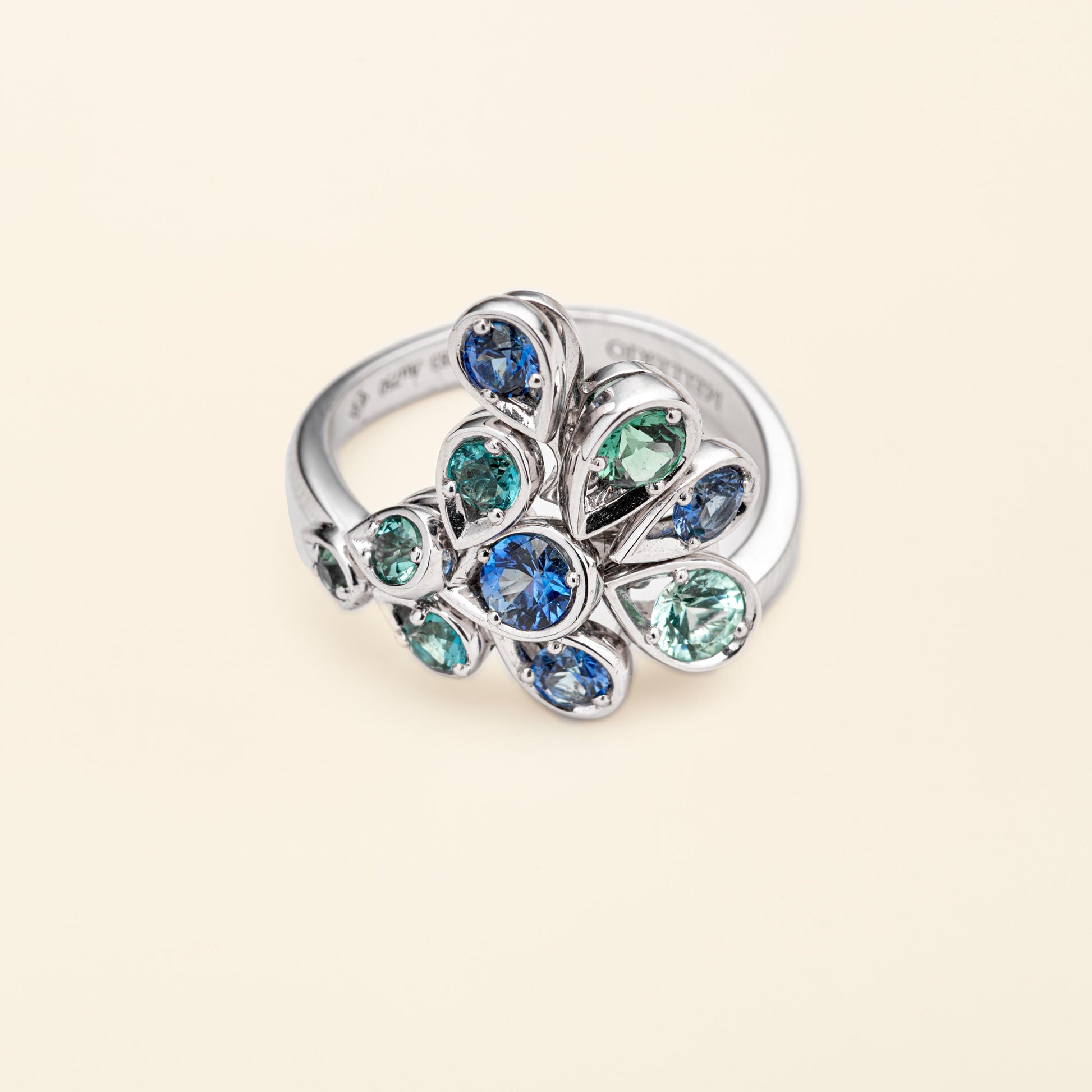 Indra ring in 18k white gold, set with sapphires and blue/green tourmalines.