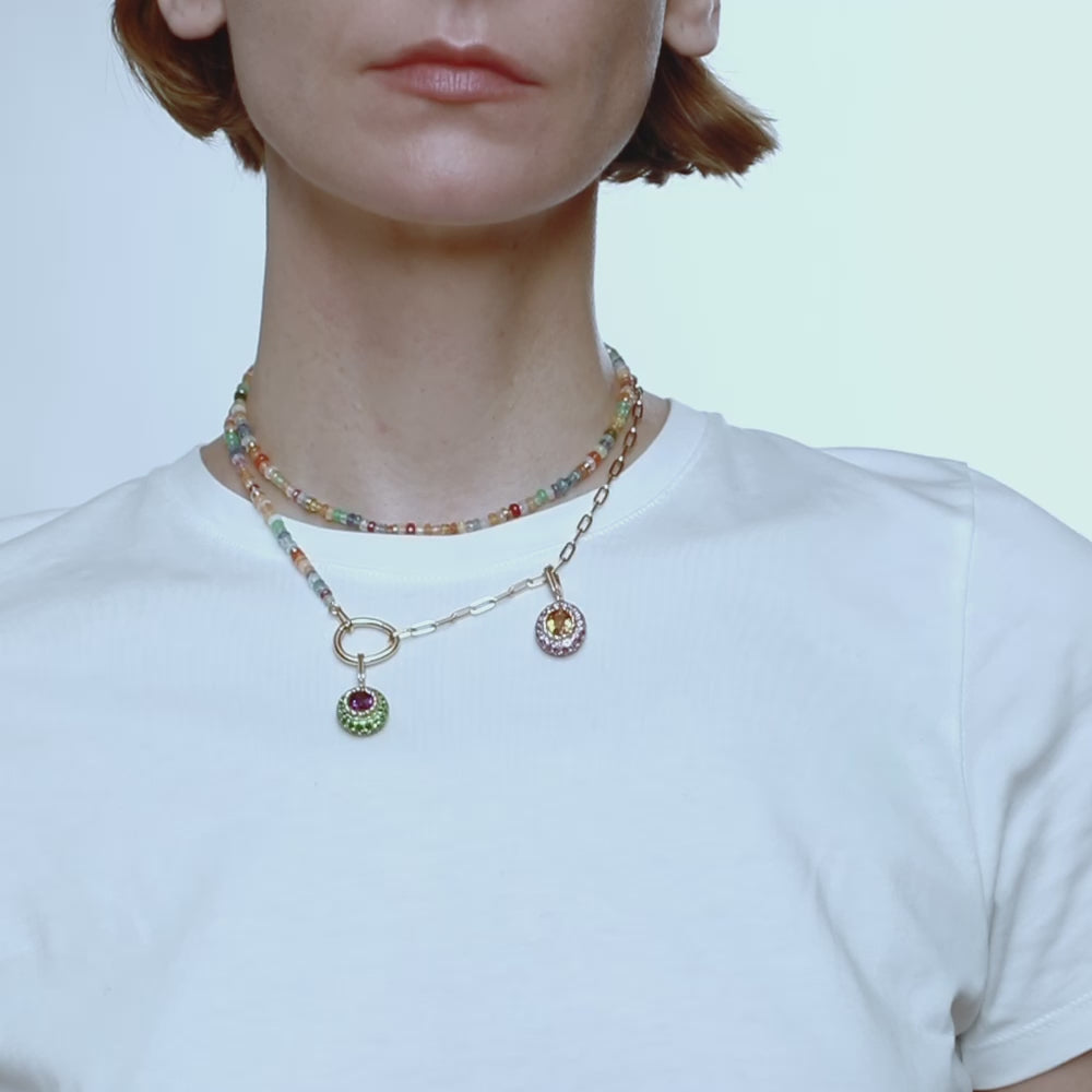Lien Pierres necklace composed of opal beads, fire opals, pink tourmalines, Tanzanites, moonstones, yellow sapphires, green tourmalines, Mandarin garnets, blue zircons, Chrysoprases and emeralds.