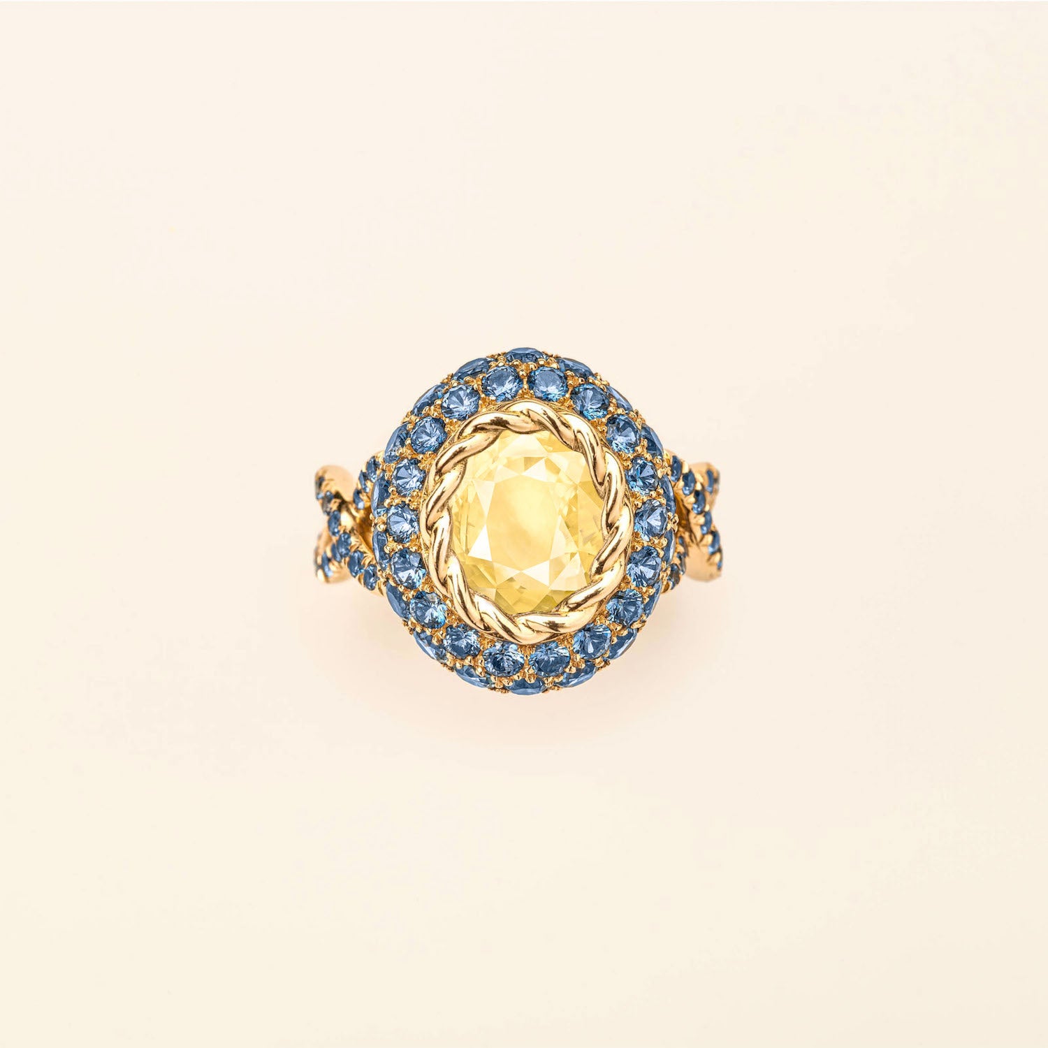 Color Queen Mellow Yellow ring in 18k yellow gold set with a yellow sapphire and a surrounded by sapphires.