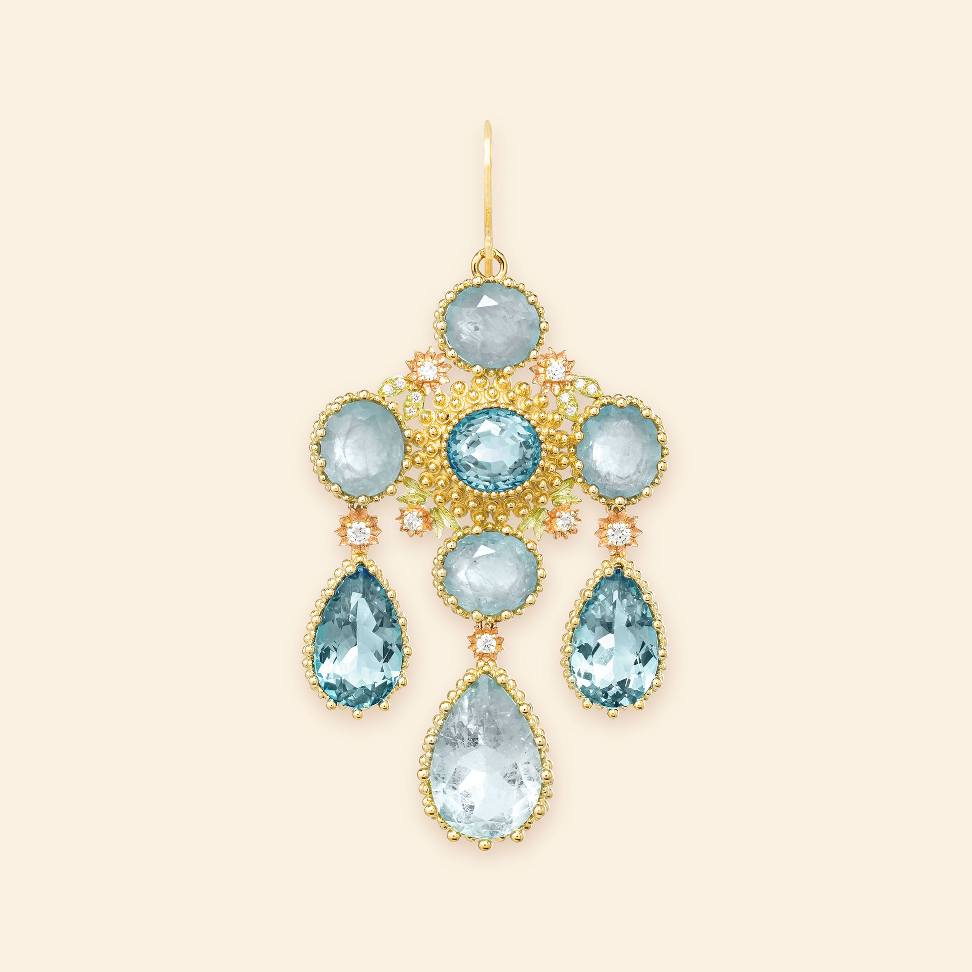 Pierreries Blue Girandole earring in 18k yellow gold set with: 1 pear-shaped aquamarine (5.08cts), 2 pear-shaped topazes (7.22cts), 4 oval-shaped aquamarines (8.79cts), 1 oval-cut topaz (2.72cts), 15 diamonds (0.24ct), 18k pink gold flowers and 18k green gold leaves, 18k yellow gold swan neck system.