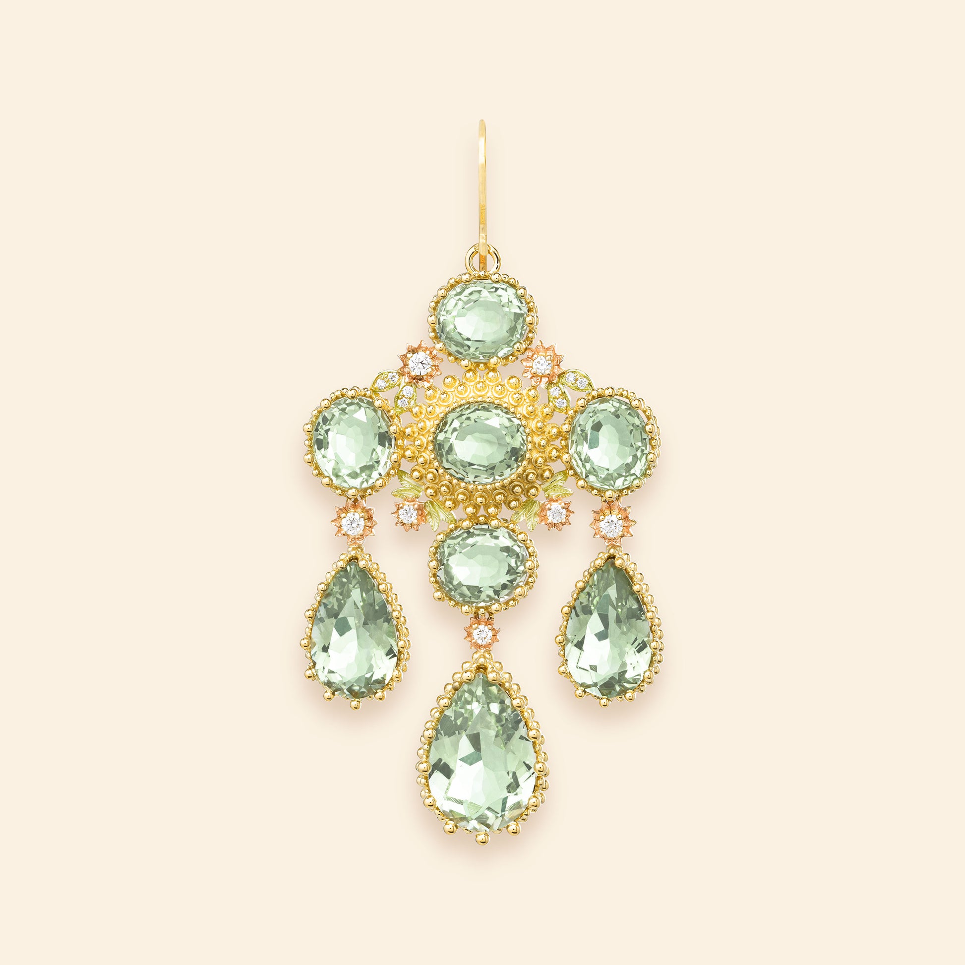 Crafted in yellow gold, pink and green gold, each design offers a radiant harmony of vibrant gems. Citrines, rutilated quartz, aquamarines, prasiolites and amethysts. The colored pieces, both bold and elegant, can be worn alone or stacked, playing with contrast and emotion.
